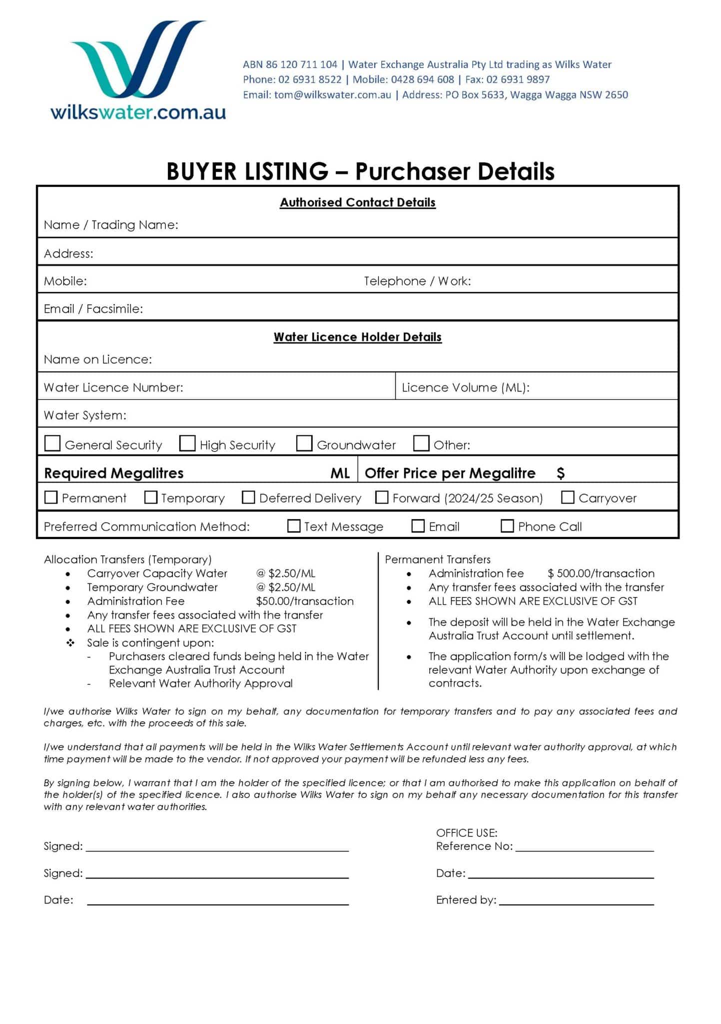 Wilks Water offers a streamlined process for buyers to manage their water purchases efficiently. Complete the Buyer Listing Form to provide your purchaser details, water licence information, and preferred communication methods.