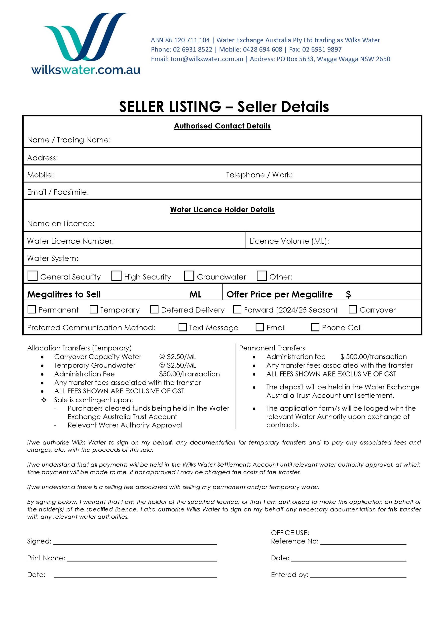 Wilks Water provides a seamless process for sellers to list and manage their water sales. Complete the Seller Listing Form to provide your authorized contact details, water licence information, and specific sale preferences.